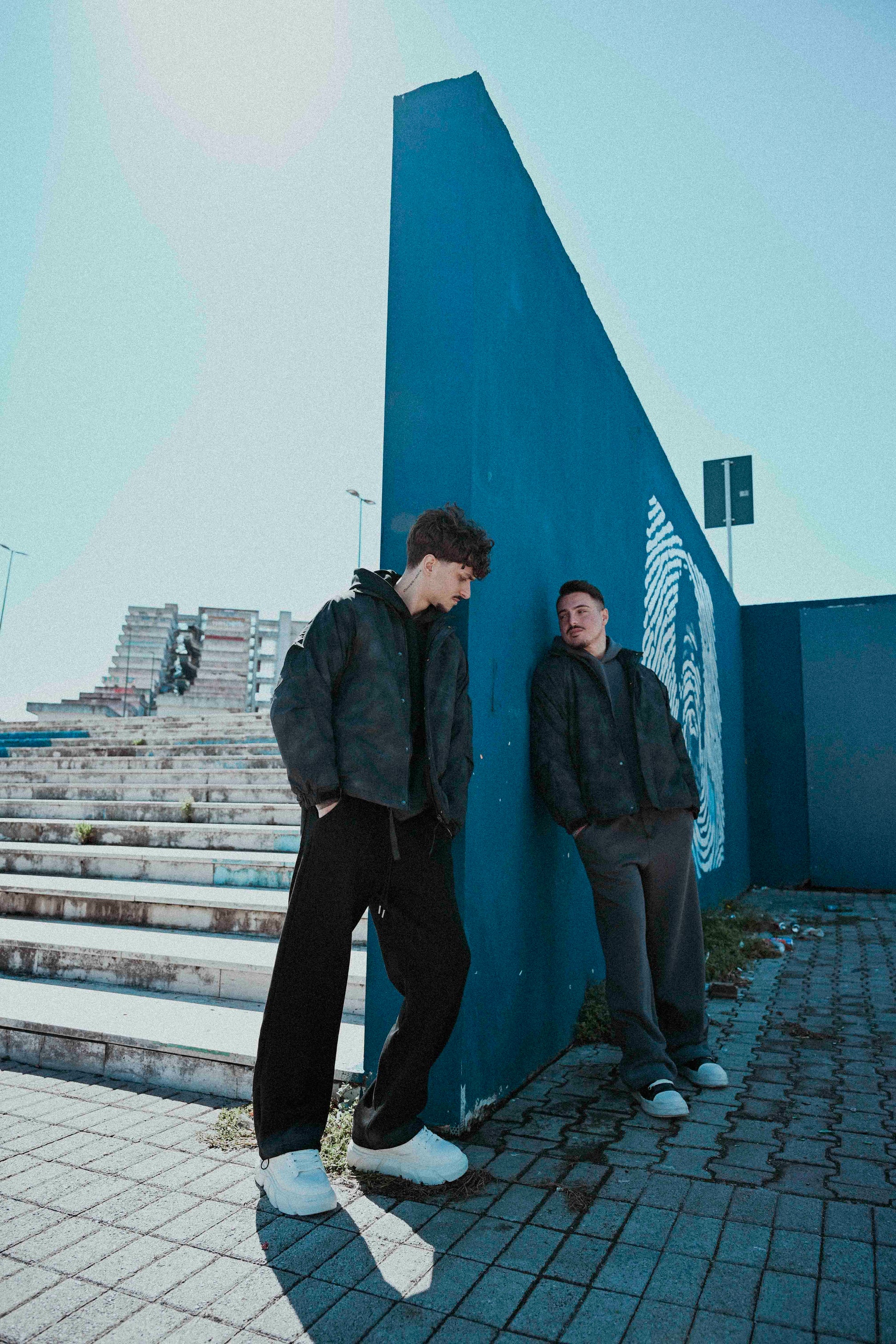 Giacca effetto bomber con stampa sul retro. I modelli indossano una L. Calza over.